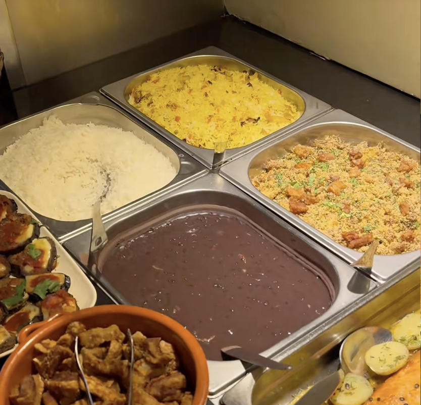 O buffet é realmente farto, com opções que vão desde queijos e saladas até carnes, frango e salsichas. Não posso deixar de mencionar os clássicos que acompanham qualquer refeição brasileira, como arroz e feijão, que estavam simplesmente deliciosos.